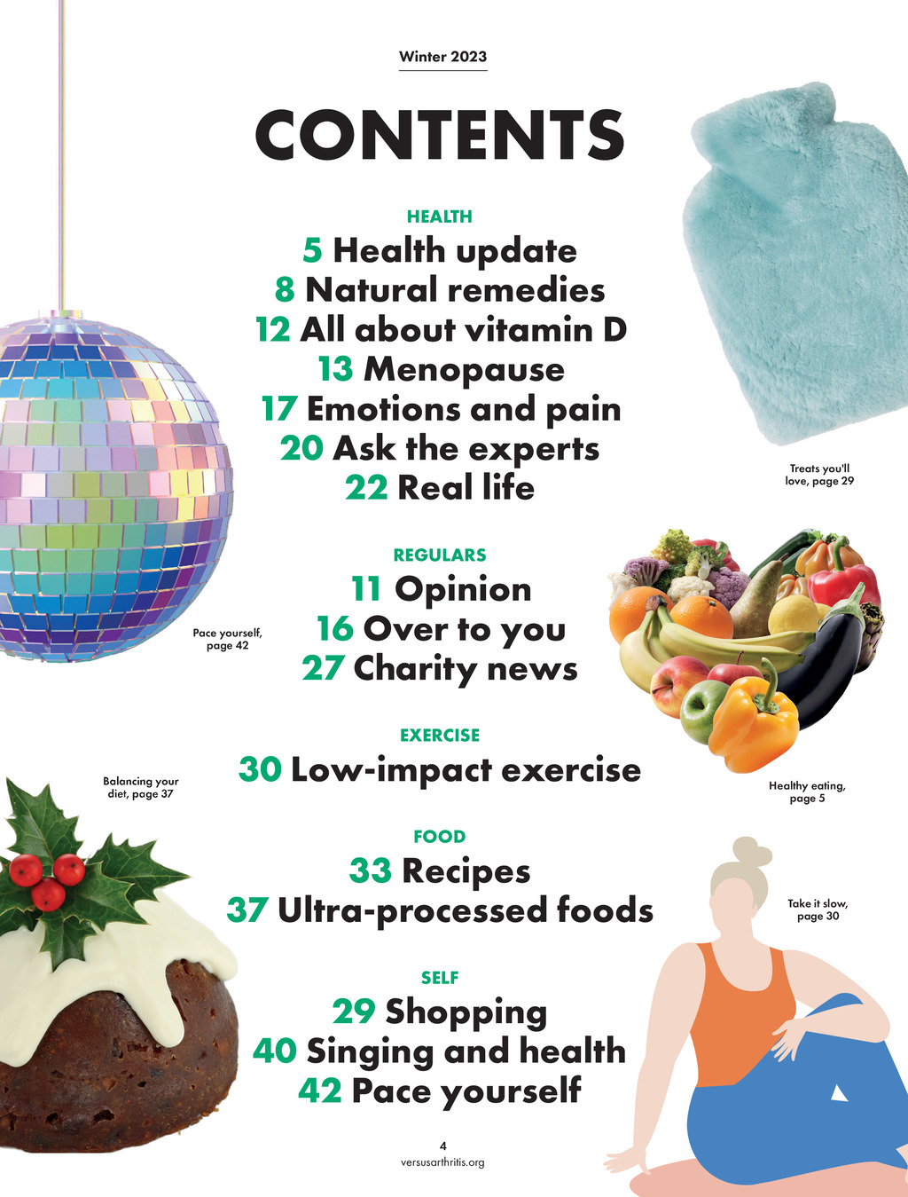 Winter 2023 CONTENTS HEALTH 5 Health update 8 Natural remedies 12 All about vitamin D 13 Menopause 17 Emotions and pain 20 Ask the experts 22 Real life Treats you ll love, page 29 REGULARS Pace yourself, page 42 11 Opinion 16 Over to you 27 Charity news EXERCISE Balancing your diet, page 37 30 Low-impact exercise Healthy eating, page 5 FOOD 33 Recipes 37 Ultra-processed foods Take it slow, page 30 SELF 29 Shopping 40 Singing and health 42 Pace yourself 4 versusarthritis.org PP04_Inspire_Winter 2023_Contents.indd 4 14/11/2023 11:33
