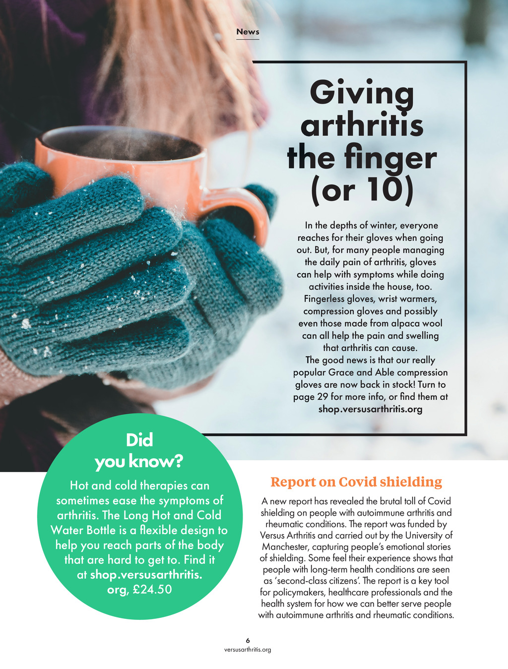 News Giving arthritis the finger (or 10) In the depths of winter, everyone reaches for their gloves when going out. But, for many people managing the daily pain of arthritis, gloves can help with symptoms while doing activities inside the house, too. Fingerless gloves, wrist warmers, compression gloves and possibly even those made from alpaca wool can all help the pain and swelling that arthritis can cause. The good news is that our really popular Grace and Able compression gloves are now back in stock! Turn to page 29 for more info, or find them at shop.versusarthritis.org Did you know? Hot and cold therapies can sometimes ease the symptoms of arthritis. The Long Hot and Cold Water Bottle is a flexible design to help you reach parts of the body that are hard to get to. Find it at shop.versusarthritis. org, 24.50 Report on Covid shielding A new report has revealed the brutal toll of Covid shielding on people with autoimmune arthritis and rheumatic conditions. The report was funded by Versus Arthritis and carried out by the University of Manchester, capturing peoples emotional stories of shielding. Some feel their experience shows that people with long-term health conditions are seen as second-class citizens. The report is a key tool for policymakers, healthcare professionals and the health system for how we can better serve people with autoimmune arthritis and rheumatic conditions. 6 versusarthritis.org PP05-07_Inspire_Winter 2023_Health News v2.indd 6 14/11/2023 11:36